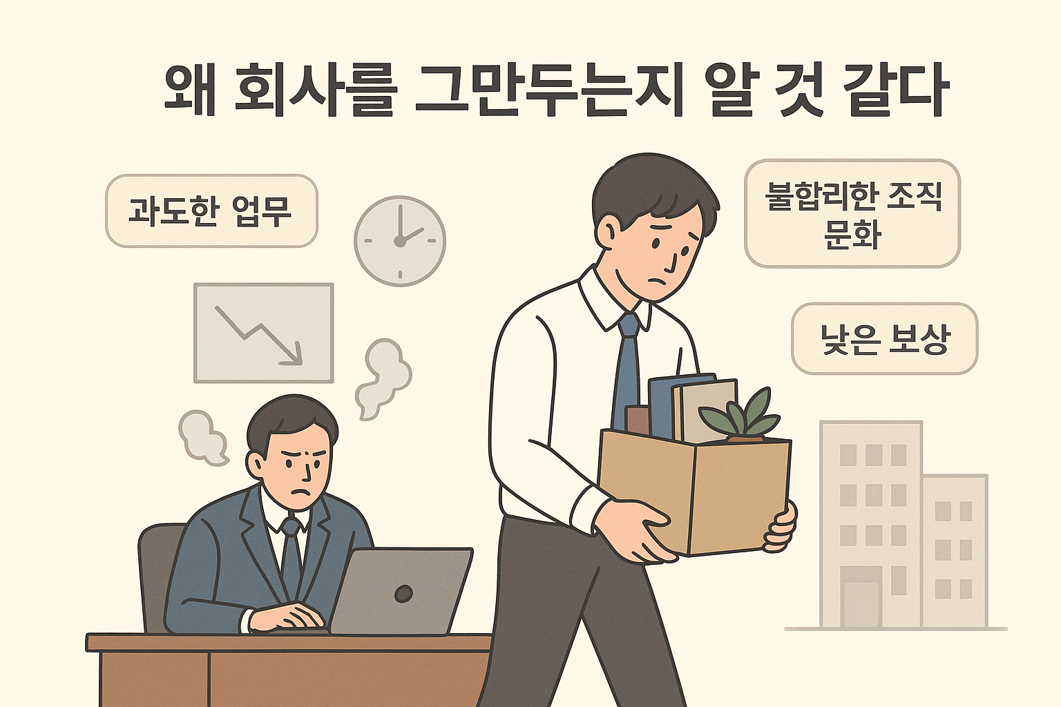회사를 그만두고 싶은 마음은 단순한 감정이 아니라, 과중한 업무, 불합리한 조직 문화, 낮은 보상, 일과 삶의 균형 붕괴, 개인의 가치관 변화 등 다양한 요인이 복합적으로 작용한 결과입니다. 이러한 문제를 해결하기 위해서는 조직 차원의 노력과 함께 개인의 자기 인식 변화가 필요합니다.